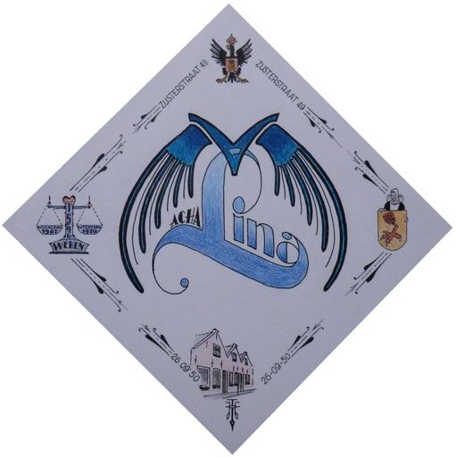 Het kalligram hiernaast heb ik gemaakt voor collega Jaap die afscheid nam. Voor hemzelf had ik al een kalligram gemaakt en nu bij deze gelegenheid was zijn vrouw Lina mijn uitgangspunt. De naam is voluit Machalina en de M maak ik van een wapenonderdeel van haar geboorteplaats Middelburg, tevens met de symboliek als beschermende vleugels voor haar gezin. Haar geboortehuis beeld ik af en in haar sterrenbeeld vermeld ik data die belangrijk zijn voor het stel. Het Zeeuwse meisje laat ik ook niet ontbreken en zij houdt het wapen van Arnemuiden (hun woonplaats) overeind.